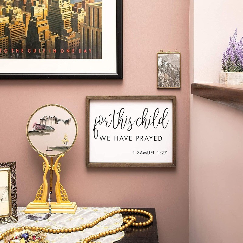 • Religious Wall Decor: Bring some joy, peace, and encouragement into your living space with this simple yet lovely religious wall decor frame: the hanging wall art features a wooden frame and canvas with a Bible Verse from 1 Samuel 1:27 that reads "For This Child We Have Prayed" in a beautiful cursive font