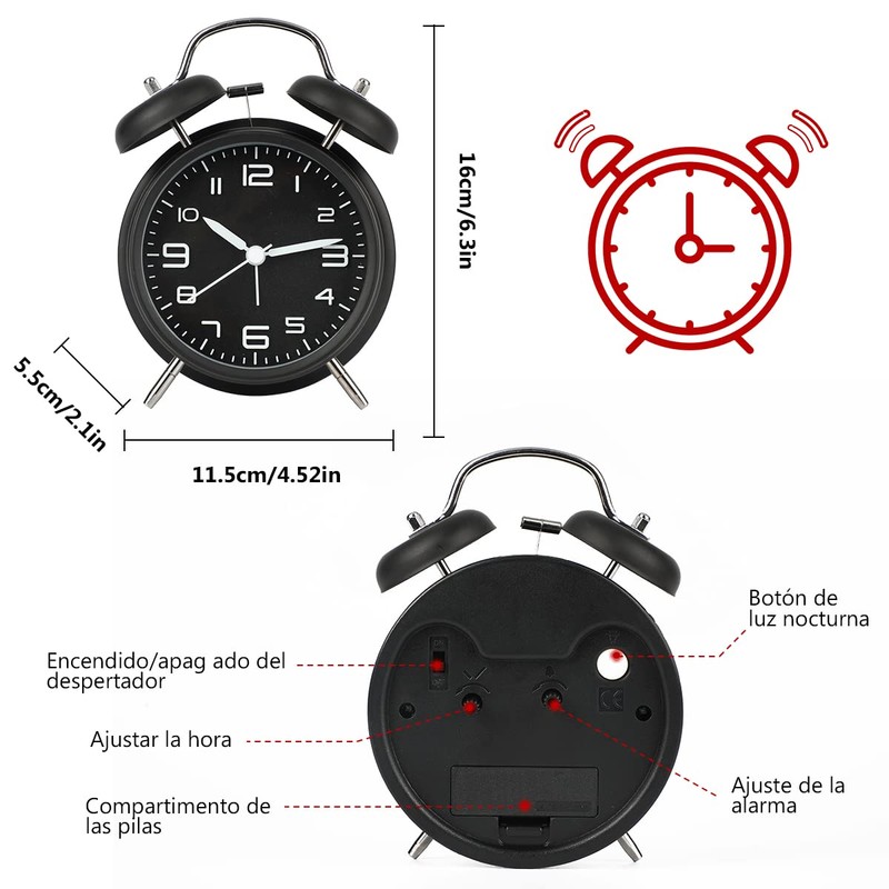 - ⏰【Loud alarma de campana doble】El reloj despertador análogo tiene un diseño clásico, de campana doble de metal y un minimartillo, la intensidad de la alarma tiene el suficiente volumen y resonancia para despertarte , especialmente adecuado para personas que tienen el sueño pesado. Ideal para levantarse a tiempo para estudiar y trabajar.