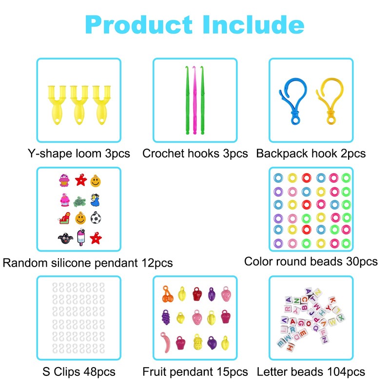 - Elastic band set: the rainbow rubber band set contains about 2500 colourful rubber bands, 3 Y-looms, 3 crochet hooks, 2 hooks, 12 random silicone pendants, 30 barrel beads, 48 S buckles, 15 pieces fruit pendants, 104 letter beads, rich accessories for your needs
