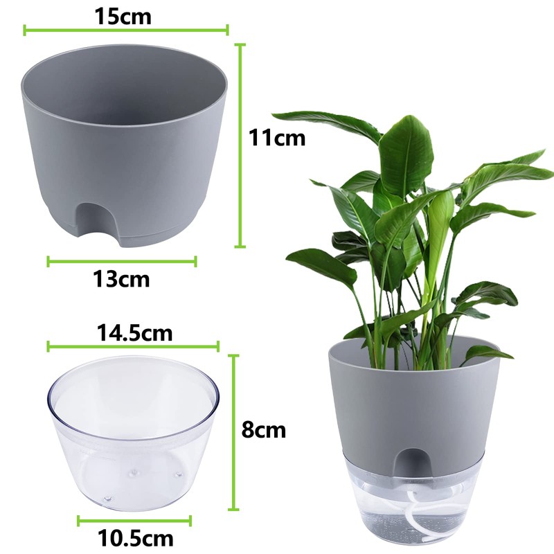 - Product specifications: the automatic watering pot is 15.3 cm wide and a set contains three grey flower pots