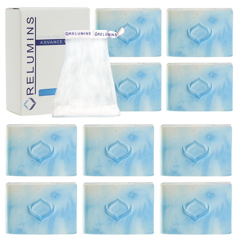 Relumins Glycolic Acid Soap Bar with Aloe and Salicylic Acid – Gentle AHA Mild Peel for Smoother, Soothing Skin | Exfoliating Bar Soap with Professional Spa Formula, 135g x 10 Bars includes Net
