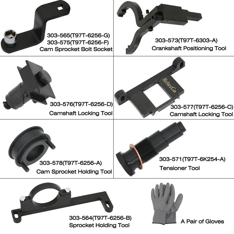 • KIT INCLUDES: This Ford 4.0 SOHC timing tool includes 8 pieces 303-564(T97T-6256-B), 303-565(T97T-6256-G), 303-575(T97T-6256-F), 303-571(T97T-6K254-A), 303-573(T97T-6303-A), 303-576(T97T-6256-D), 303-577(T97T-6256-C), 303-578(T97T-6256-A), with a carrying case for easy transport and a pair of gloves.