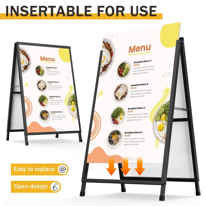 • 【Portable Structure】 The sidewalk sign has a foldable design, easy to carry and store, it can easily fit in the trunk of your car. It does not damage the ground structure, easy to replace the poster, perfect for advertising display.