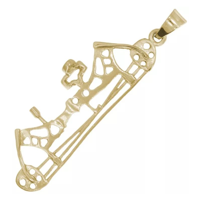 Compound Bow charm by Rembrandt. Measures approximately 1.5 inches x 0.5 inches (38.1mm x 12.7mm). Genuine sterling silver with gold-plating.This charm will not fit slide-on bead-style bracelets. HOWEVER, you can add a Rembrandt CharmDrop to make it fit.