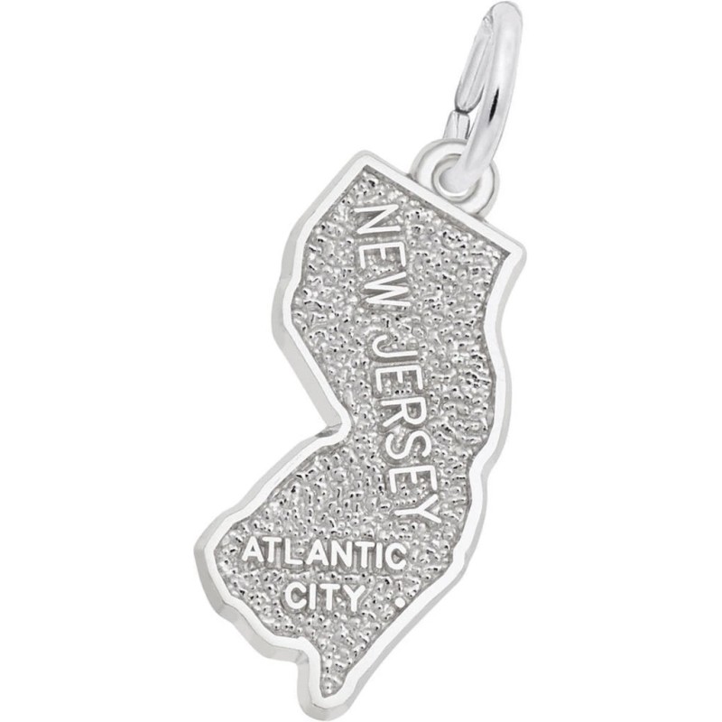 Atlantic city new jersey map charm by Rembrandt. Measures approximately 0.81 inches x 0.45 inches (20.45mm x 11.55mm). Genuine rhodium-plated sterling silver.This charm will not fit slide-on bead-style bracelets. HOWEVER, you can add a Rembrandt CharmDrop to make it fit.