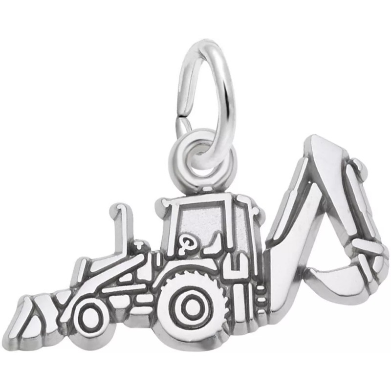 Backhoe charm by Rembrandt. Measures approximately 0.39 inches x 0.74 inches (9.8mm x 18.88mm). Genuine rhodium-plated sterling silver.This charm will not fit slide-on bead-style bracelets. HOWEVER, you can add a Rembrandt CharmDrop to make it fit.