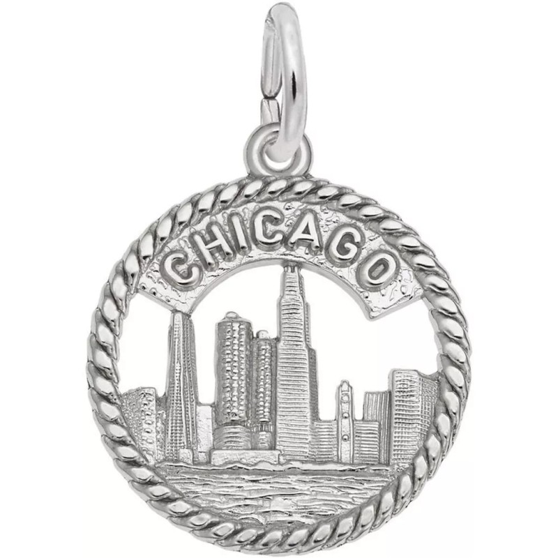 Chicago skyline charm by Rembrandt. Measures approximately 0.76 inches x 0.76 inches (19.25mm x 19.25mm). Genuine rhodium-plated sterling silver.This charm will not fit slide-on bead-style bracelets. HOWEVER, you can add a Rembrandt CharmDrop to make it fit.