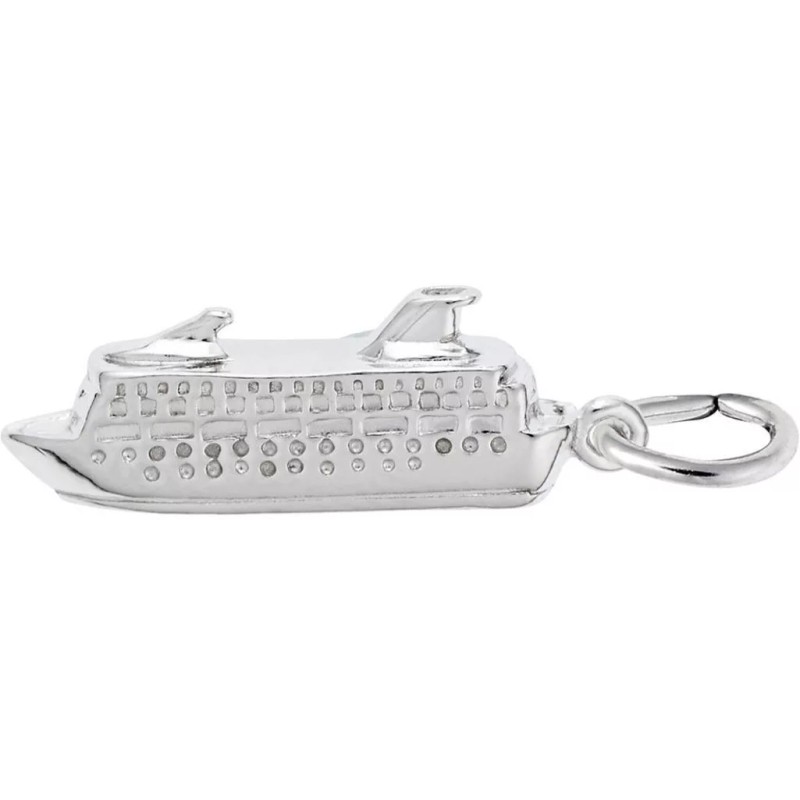 3 Dimensional Cruise ship charm by Rembrandt. Measures approximately 0.37 inches x 0.95 inches (9.47mm x 24.03mm). Genuine rhodium-plated sterling silver.This charm will not fit slide-on bead-style bracelets. HOWEVER, you can add a Rembrandt CharmDrop to make it fit.