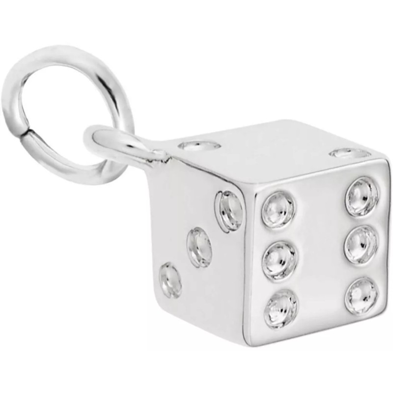 3 Dimensional Detailed dice charm by Rembrandt. Measures approximately 0.26 inches x 0.28 inches (6.61mm x 7.1mm). Genuine rhodium-plated sterling silver.This charm will not fit slide-on bead-style bracelets. HOWEVER, you can add a Rembrandt CharmDrop to make it fit.