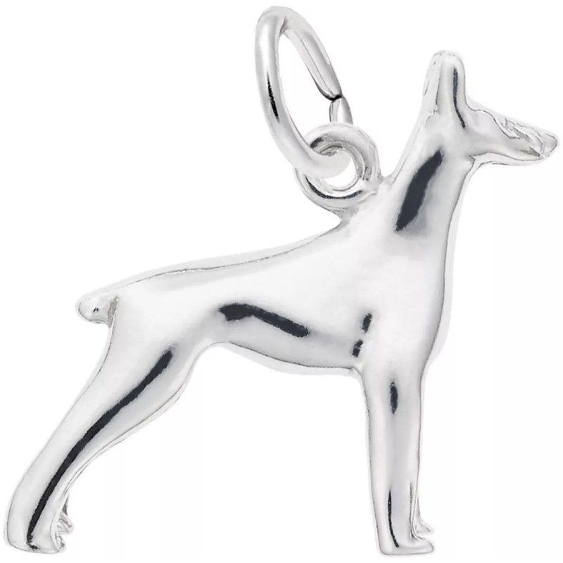 3 Dimensional Doberman dog charm by Rembrandt. Measures approximately 0.7 inches x 0.57 inches (17.76mm x 14.42mm). Genuine rhodium-plated sterling silver.This charm will not fit slide-on bead-style bracelets. HOWEVER, you can add a Rembrandt CharmDrop to make it fit.