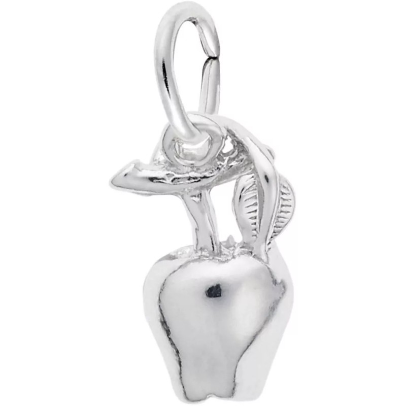 3 Dimensional Hanging apple charm by Rembrandt. Measures approximately 0.32 inches x 0.17 inches (8.09mm x 4.29mm). Genuine rhodium-plated sterling silver.This charm will not fit slide-on bead-style bracelets. HOWEVER, you can add a Rembrandt CharmDrop to make it fit.