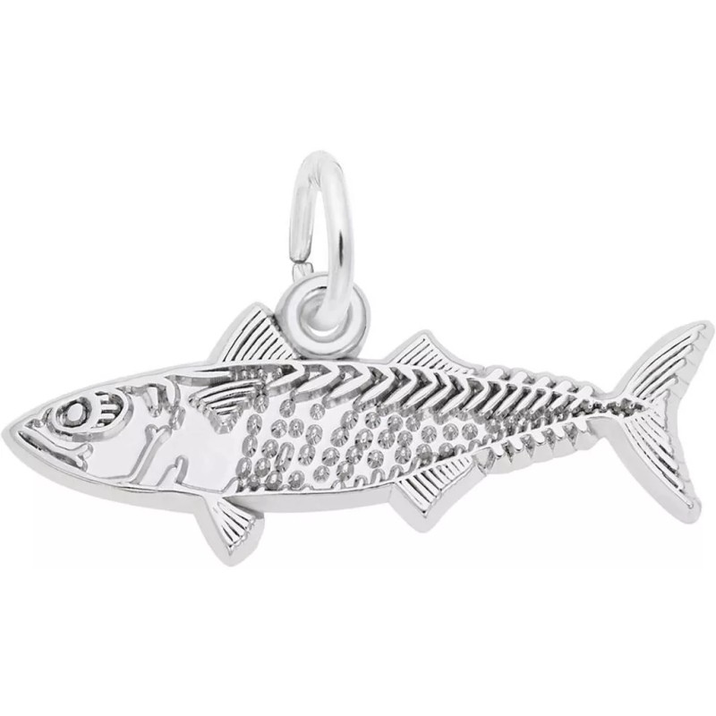 Mackerel fish charm by Rembrandt. Measures approximately 0.36 inches x 1 inches (9.03mm x 25.29mm). Genuine rhodium-plated sterling silver.This charm will not fit slide-on bead-style bracelets. HOWEVER, you can add a Rembrandt CharmDrop to make it fit.