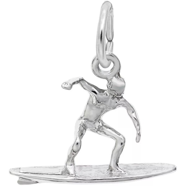 3 Dimensional Surfer charm by Rembrandt. Measures approximately 0.56 inches x 0.72 inches (14.26mm x 18.38mm). Genuine rhodium-plated sterling silver.This charm will not fit slide-on bead-style bracelets. HOWEVER, you can add a Rembrandt CharmDrop to make it fit.