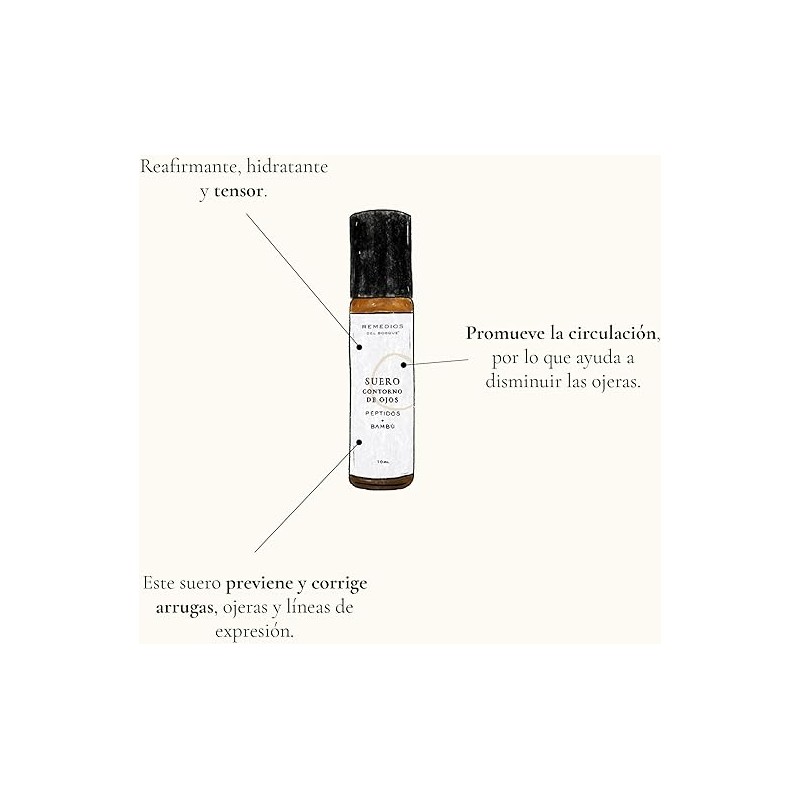 - CARACTERÍSTICAS: Este es un suero lleno de péptidos, aminoácidos naturales que nutren la piel. También tiene bambú, árbol con propiedades reafirmantes, reestructurantes y antiinflamatorias que te ayudarán con las bolsas, las líneas finas de expresión y las ojeras. ¡Pruébalo frío!