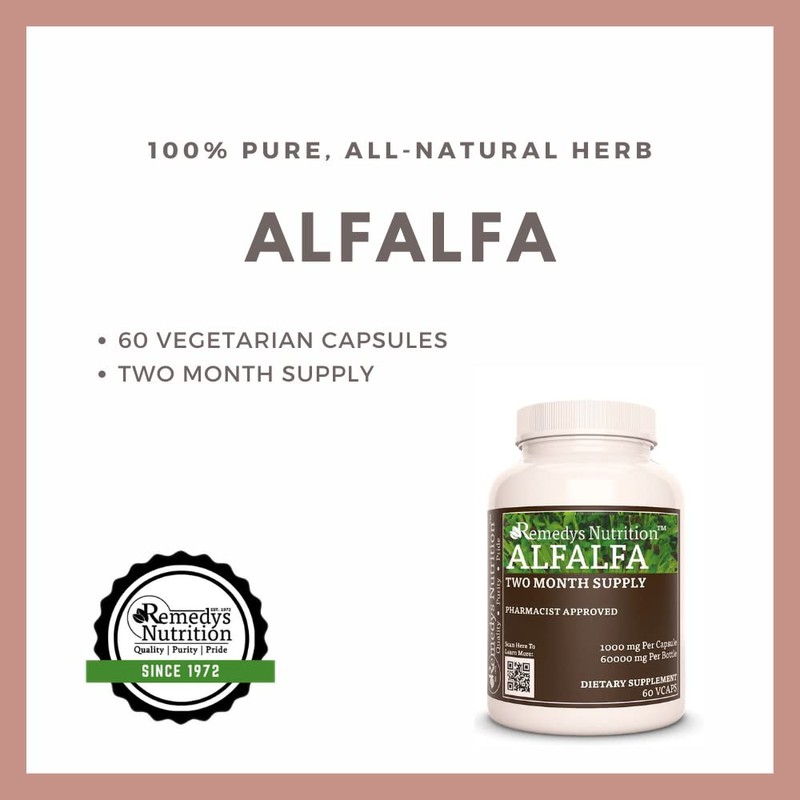 - WHAT YOU GET: 1 bottle of Remedy's Nutrition Alfalfa herbal supplement with sixty 1000mg vegan capsules (two month supply).