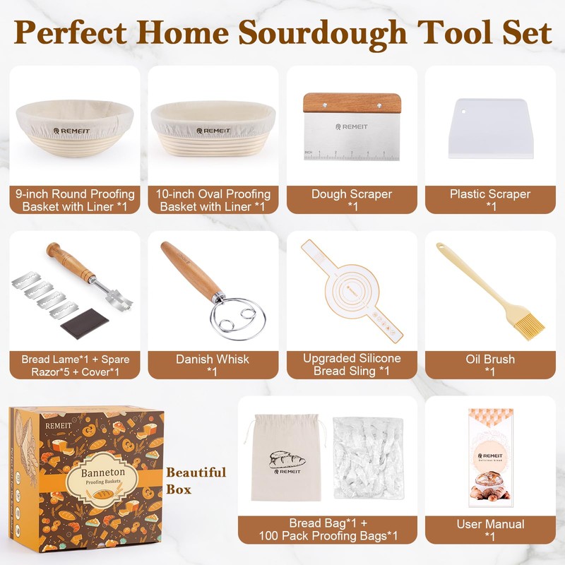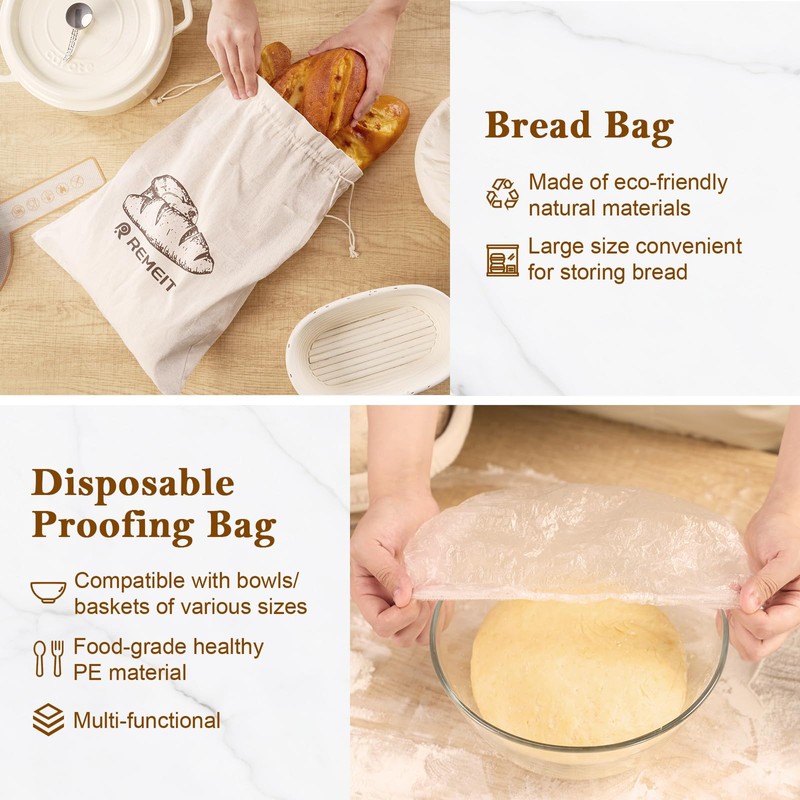 - Easy to Use and Tidy: Say goodbye to uneven dough shapes and bake like a seasoned pro, achieve perfect texture and a crispy crust effortlessly with REMEIT's complete banneton bread proofing basket set. Enjoy the ease of bread proofing with banneton baskets designed for convenience. Cleaning up afterward is a breeze, ensuring a mess-free kitchen every time