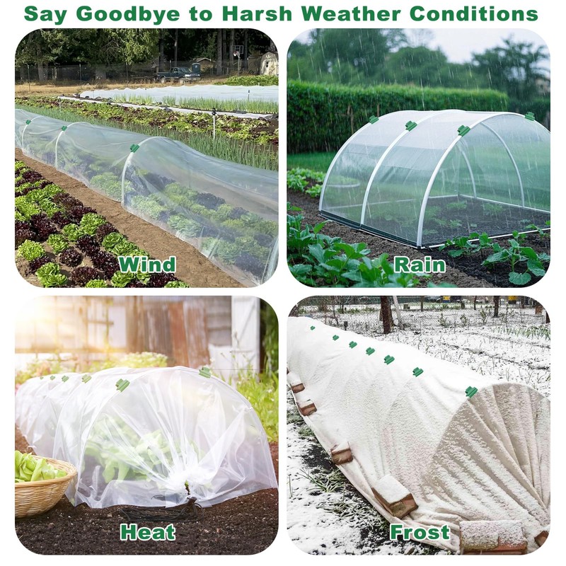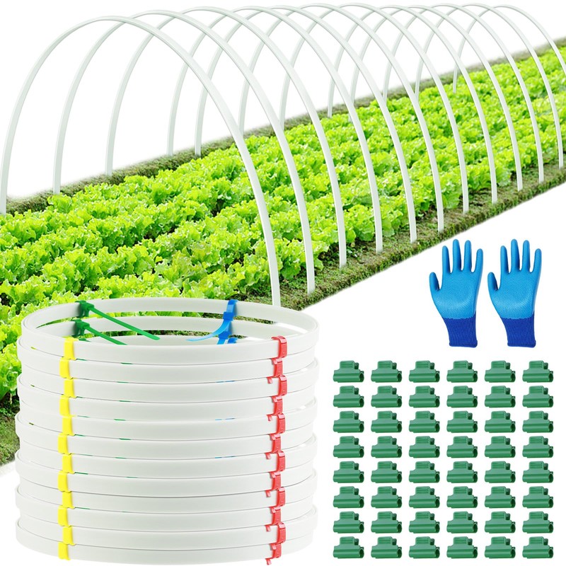 - Greenhouse Hoop Kit: Includes 12 garden hoops, 48 clamps, and 1 pair of gloves (garden netting not included), idea for patios, vegetable gardens, and garden hoops for raised beds. Wear gloves to protect your hands and open hoops slowly to avoid injury