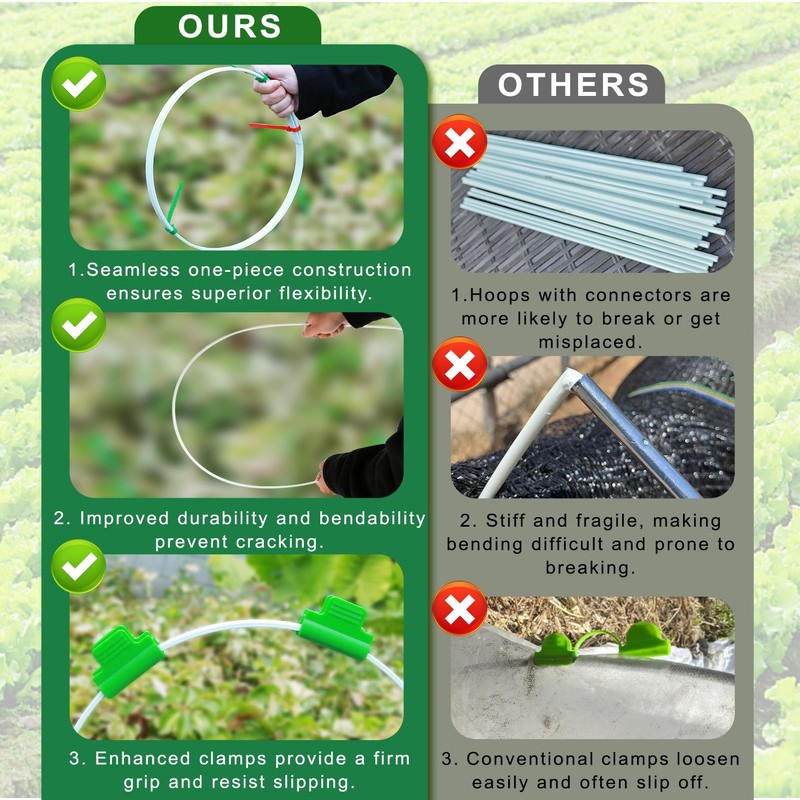 - Upgraded Fiberglass Material: Garden hoops with flat-strip fiberglass design offer strong, flexibility, rust, and oxidation resistance. Easily bendable for various uses. With upgraded clips, these garden hoops for raised beds withstand harsh conditions