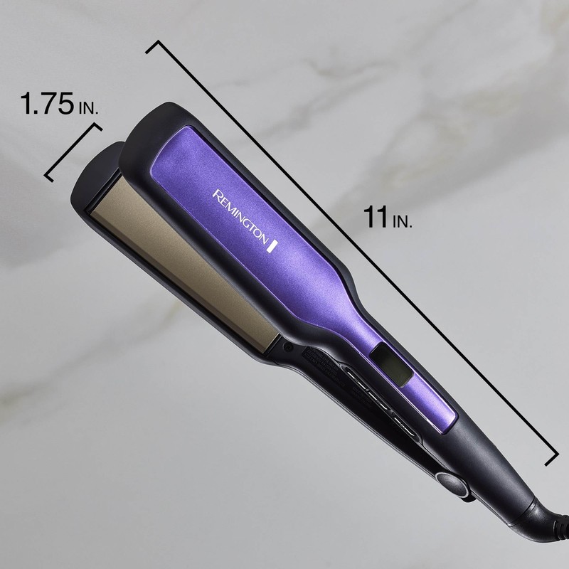 Boost your styling control with the Remington 1.75" Anti-Static Flat Iron. Anti-Static Technology reduces the amount of negatively charged particles during styling for 50% less static and fly aways. The ceramic plates with titanium protection coating heat up fast to create a smooth glide. The 1 ¾" plates are 30% longer for quicker styling and less hair damage. The digital controls with LCD screen make it easy for you to find the temperature you prefer for your hair type, with a range of six heat settings from 310°F to 410°F. vs. Remington standard ceramic straightener vs. 85mm straightener plates.