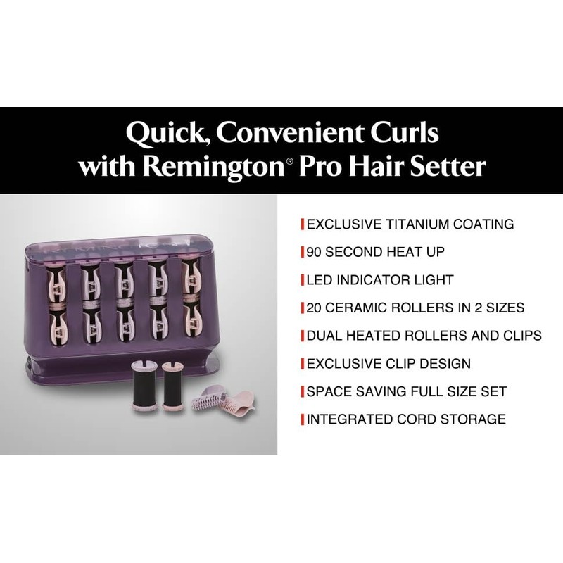 America's favorite setter brand just got even better! The Remington Pro hair setter delivers the perfect amount of heat to set curls in just five minutes! Dual heating technology heats curls from the inside and outside, while the exclusive clip design helps reduce snags and creases. This set comes with large (") and Medium (/") rollers so you can quickly create a head full of beautiful curls! Other features include: -second heat-up, space-saving design, cord storage, -year y. Nielsen, weeks, units, ending March