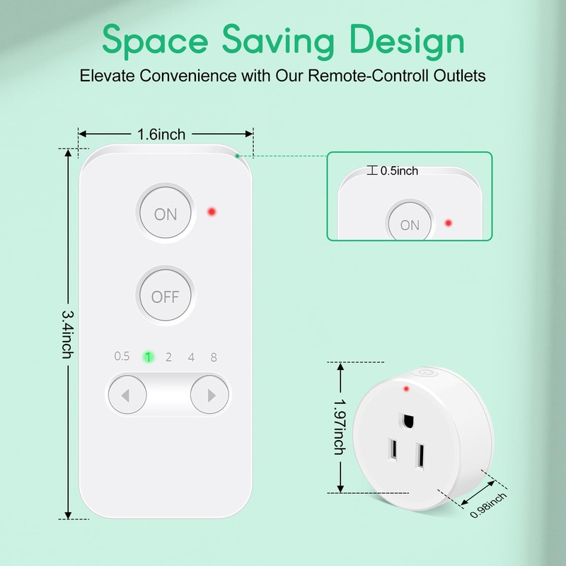 - 【Countdown Timer】Remote outlet switch is designed to change your home automation experience! Featuring a countdown timer with 5 distinct settings: 0.5, 1, 2, 4, and 8 hours, outlet remote offers convenience in scheduling your electrical appliances. Tailor your lifestyle by programming your devices to operate according to your specific needs and preferences.
