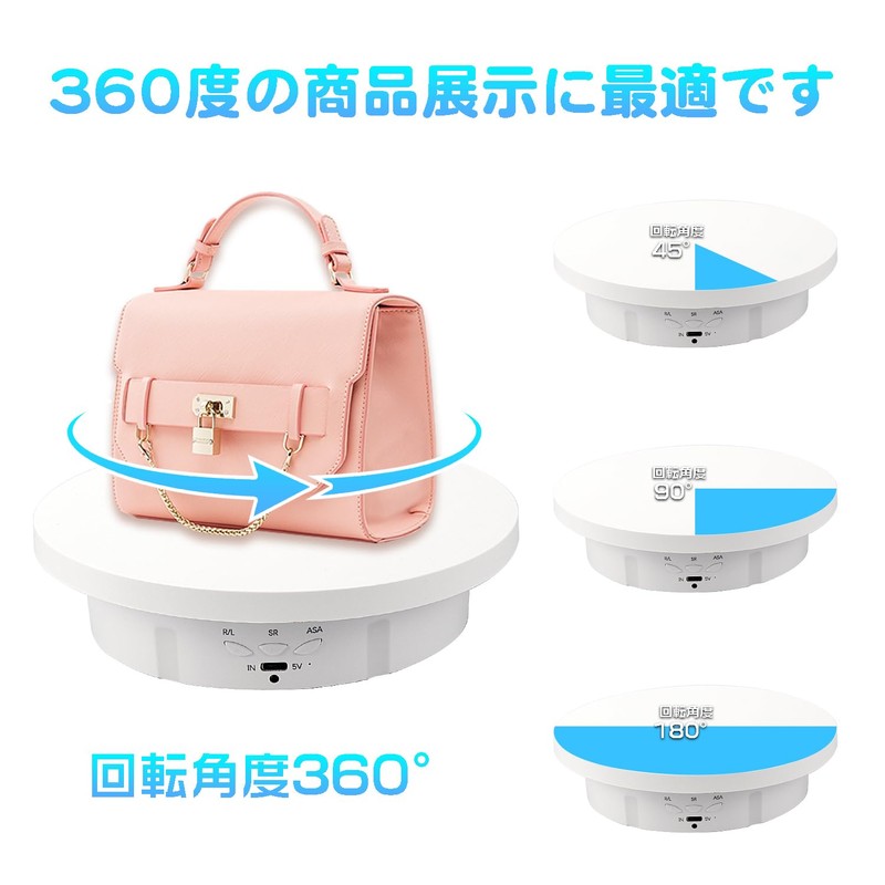 • EASY TO USE: Electric turntable with manual and remote control. Press or hold any button for 3 seconds to stop starting, the R/L button allows you to change the direction of the right turn left and the SR button can adjust the speed of 2-4-6 rpm. Adjustable rotation angle with ASA button. Choose from 3 angles, 45-180-360°. In addition, you can use the remote control to control the rotation angle, speed, direction and rotation modes from a distance