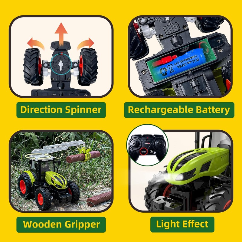 - High compatibility: the exact scale of the tractor toy is 1:24 and can be used with other accessories for the farm toy in the shop. Includes 1 x forest tractor with wooden trailer, 3 tree trunks, 1 x rechargeable battery, 1 x remote control, 1 x USB charging cable, 1 x screwdriver.