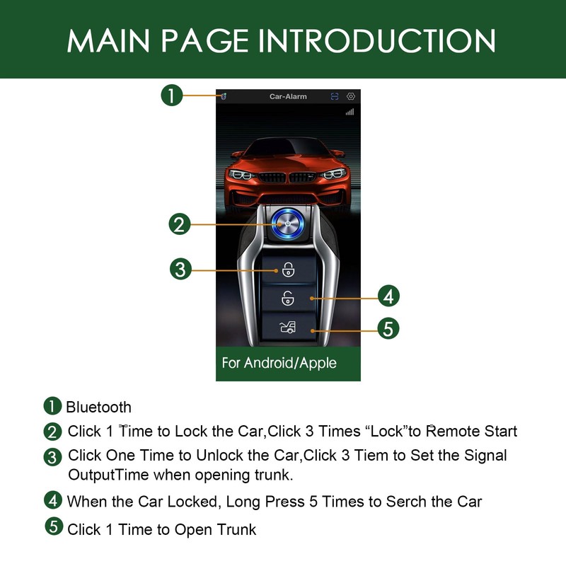 - 【Remote Key & App Control】Use App or remote key to remote engine,lock/unlock the car, open the trunk, Open Trunk Release, Turn On Reservation Mode. Suitable for Android and IOS smart phones.
