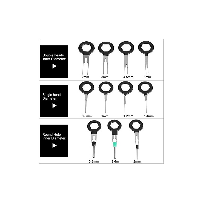 • Package Included: This universal pin removal tool kit includes 4Pcs Single head diameter, 4Pcs Double heads inner Diameter, 3Pcs Round Hole Inner Diameter