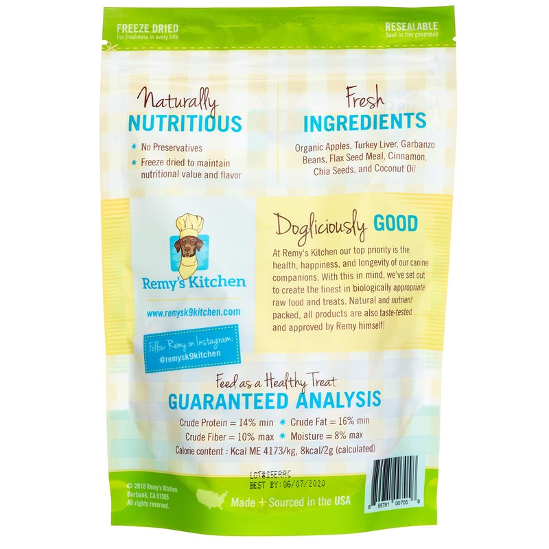 Freeze dried treats loaded with super ingredients for your dogs to live their best life! These crunchy treats are made with organic apples, turkey liver, flax and chia seeds, kale, coconut oil plus cinnamon for anti inflammatory benefits. Grain free, human grade ingredients. These treats are made and sourced in the USA