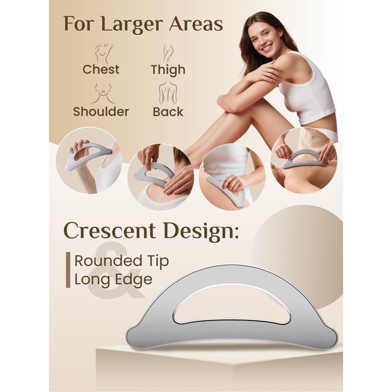 - Crescent-Shaped for Larger Areas: Fits chest, thighs, shoulders and back. Rounded tip targets pressure points to support lymphatic drainage, while the long edge glides gently for broad muscle relief and contouring