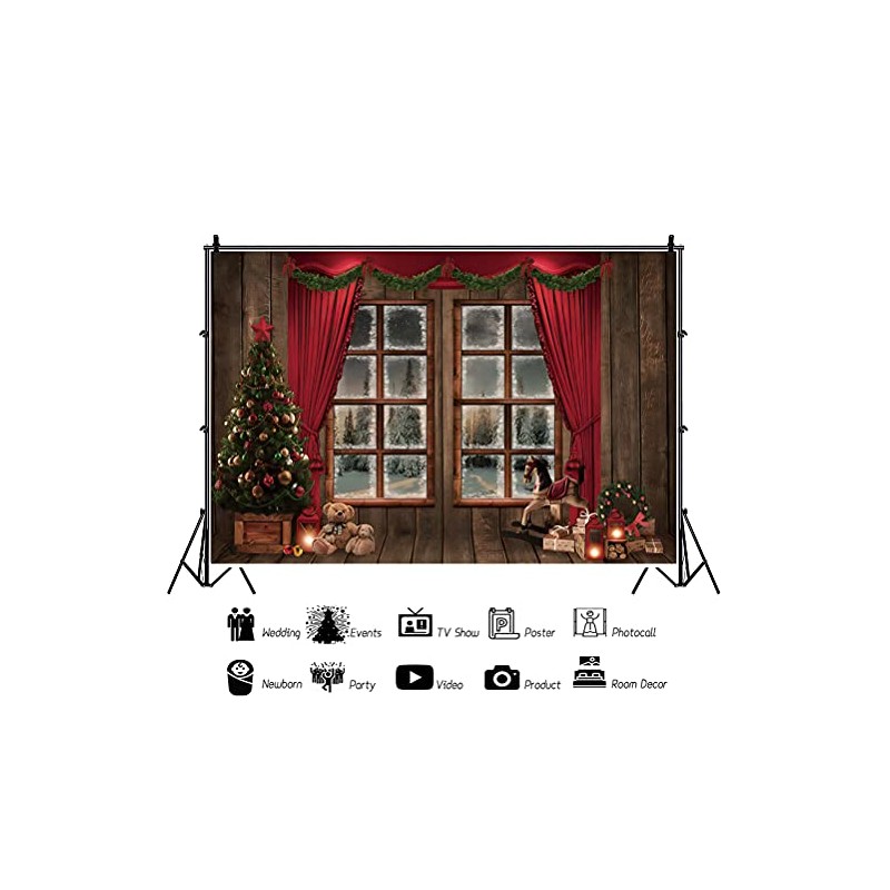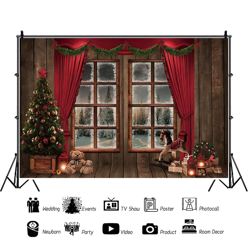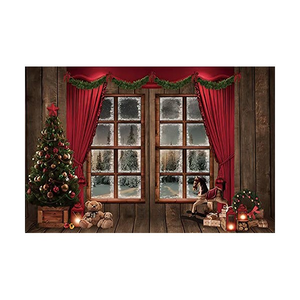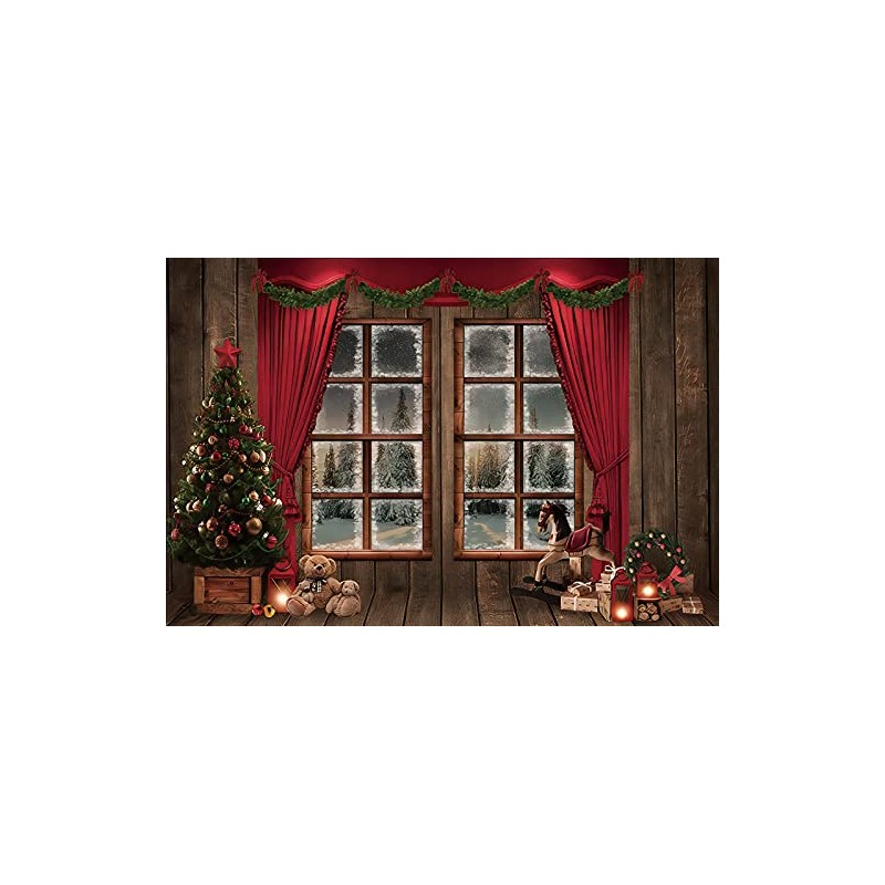 Renaiss 3 x 2.5 m Rustic Christmas Indoor Background Wooden Window Snow Christmas Tree Background for Photography Winter Holiday Home Party Supplies Family Child Portrait Shooting Studio Props