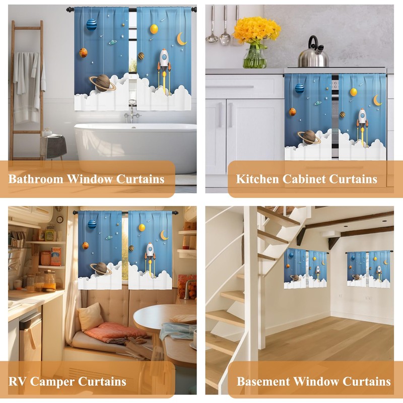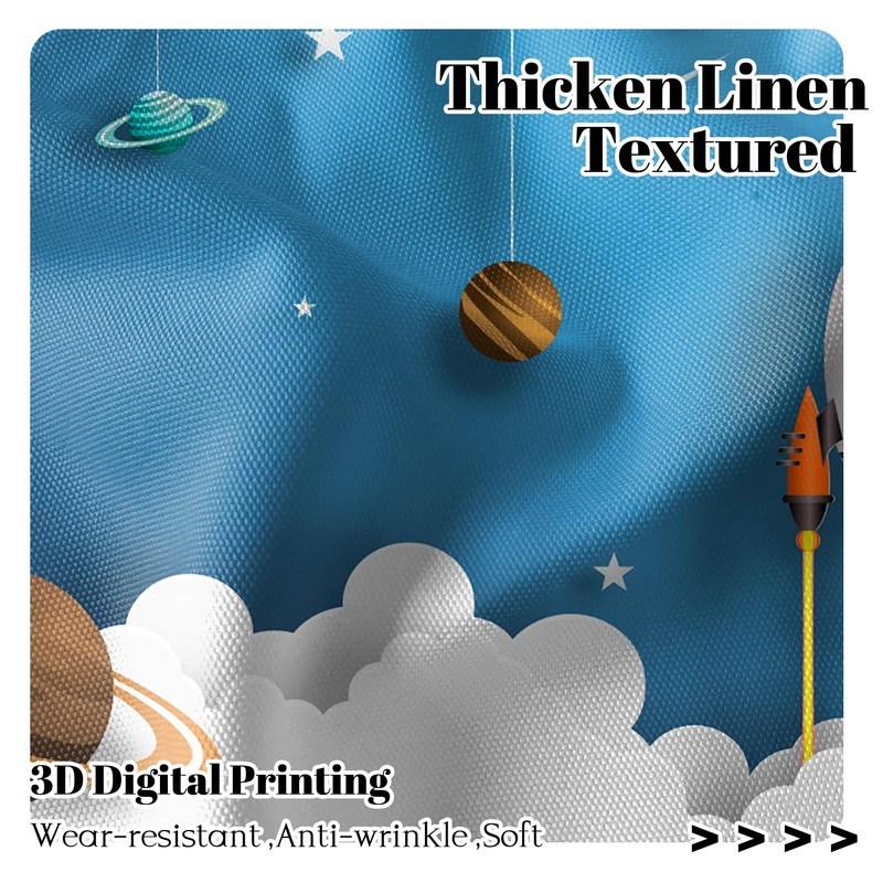 Renaiss 42 x 63 Inch Cartoon Space Blackout Curtains for Kid Boy Bedroom Study Game Room Rocket Planet Solar System Blue Linen Window Treatment Spacecraft Rod Pocket Window Drapes 2 Panels