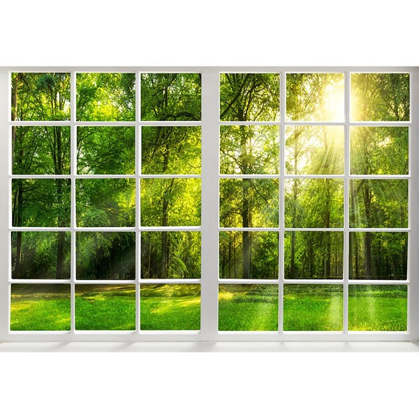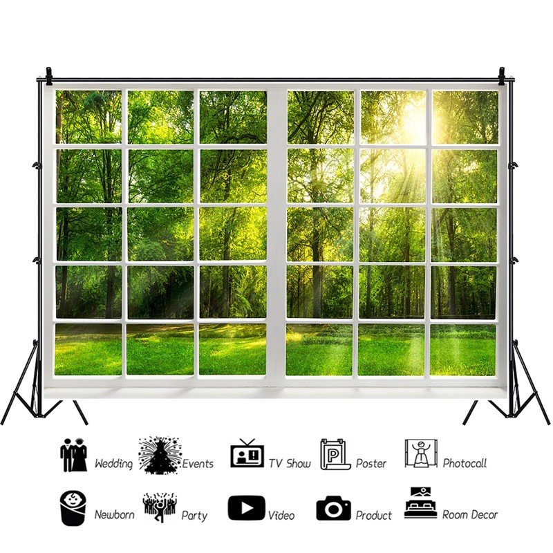 Renaiss 5x3ft Sunshine Forest Window Backdrop for Photoshoot Portrait Green Trees Woodland Spring Summer Scenery French Window Photography Background Scenic Wallpaper Party Decor Photo Booth Props