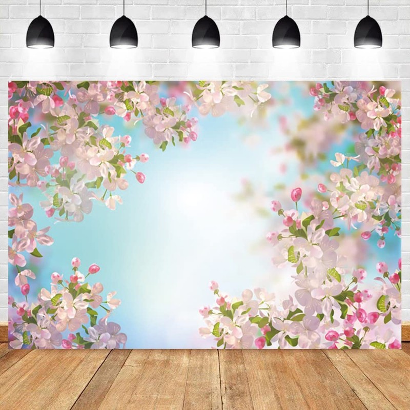 Renaiss 7x5ft Pink Floral Backdrop Romantic Cherry Blossom Blue Sky Sunshine Nature Scenery Polyester Photography Background for Wedding Kids Baby Birthday Party Decor Photo Props