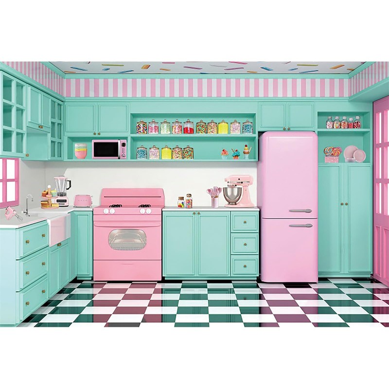 Renaiss Pink Green Kitchen Backdrop 10x6.5ft Vinyl Dream House Ktchen Floor Kitchen Scene Photography Background for Girls Woman Video Shooting Photo Studio Prop