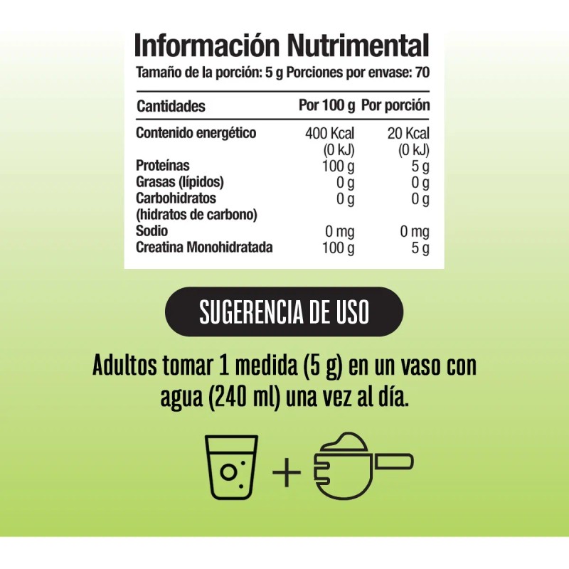 • Modo de empleo: Tomar una porción (5g) en un vaso de agua o jugo (240ml), 1 vez al día.