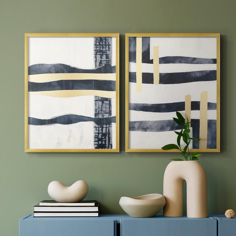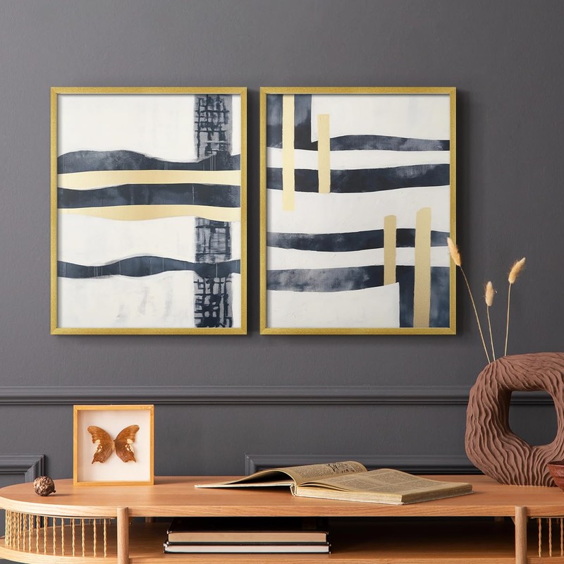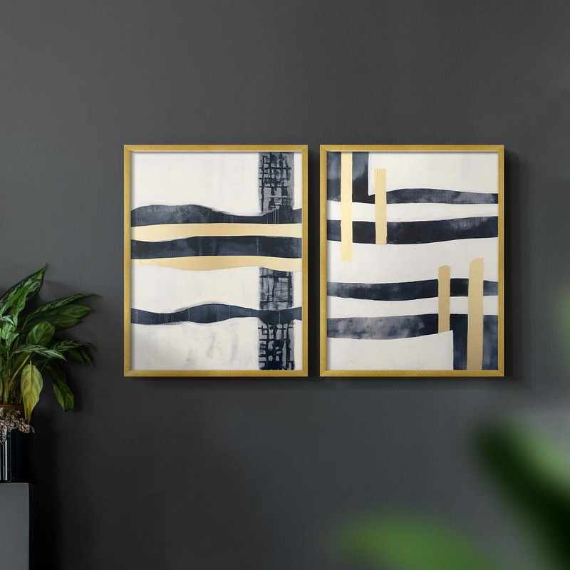 Renditions Gallery Set of 2 Peel & Stick Framed Prints, Abstract Wall Art, Blue & Golden Strips Artwork Wall Decor, Re-Stickable - Ready to Hang - 11"x14" - Gold Frame LT607
