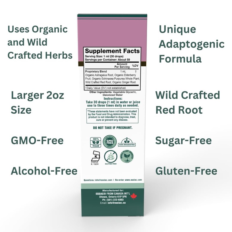 - ORGANIC VEGAN FORMULA - Per Serving (1 mL): Proprietary Adaptogen Blend: Organic Astragalus Root, Organic Elderberry Fruit, Organic Whole Plant Sourced Echinacea Purpurea, Wild Crafted Red Root and Organic Ginger Root. Other Ingredients: Palm Kernel Vegetable Glycerin and Purified Water.
