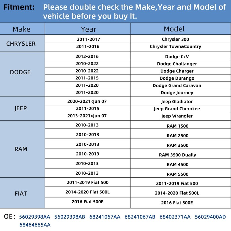 - APPLICATIONCompatible for Chrysler:2009-2017 300,2011-2016 Town&Country / Dodge:2012-2016 C/V,2010-2022 Challenger,2010-2022 Charger,2011-2015 Durango,2011-2020 Grand Caravan,2011-2022 Journey / Fiat:2011-2019 500,2014-2020 500L,2016 500E / Jeep:2020-2021 Gladiator,2011-2015 Grnad Cherokee,2013-2021 Wrangler / RAM:2010-2013 RAM 1500 2500 3500 4500 5500