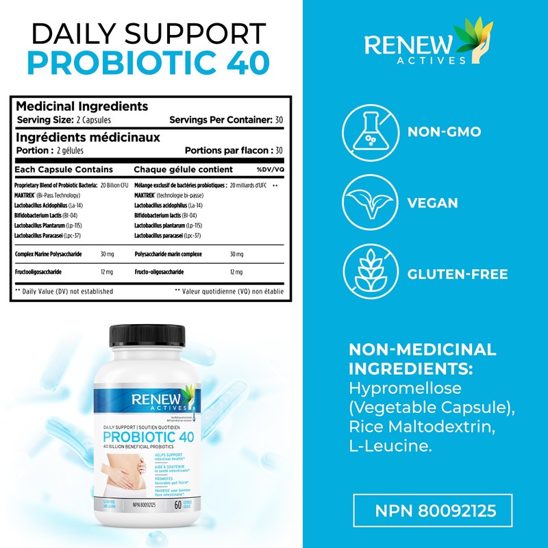 Renew Actives RENEW ACTIVES Double Strength Probiotic 40 Billion CFU (2 Capsules)C Supports Digestive Health & Gut Flora C Probiotic Supplement for Men & Women C Daily Bloating Relief - Made in Canada C 60 Capsules (2pk)