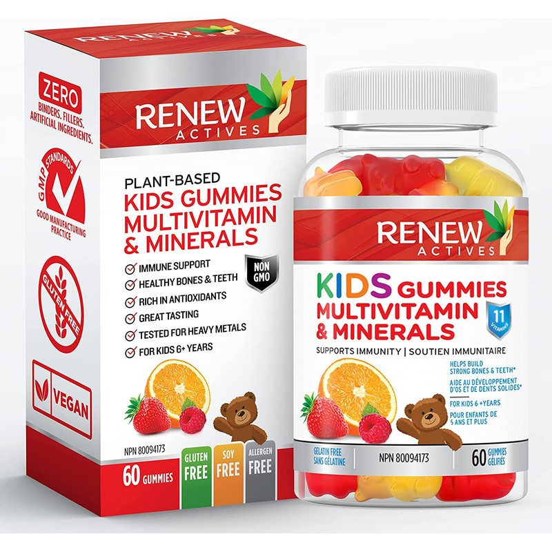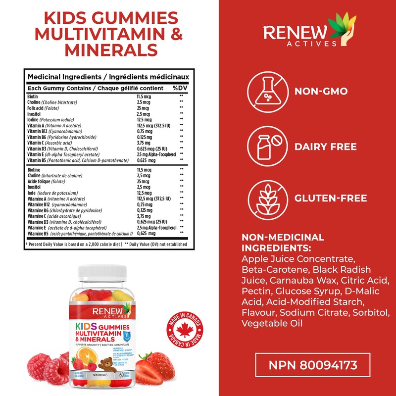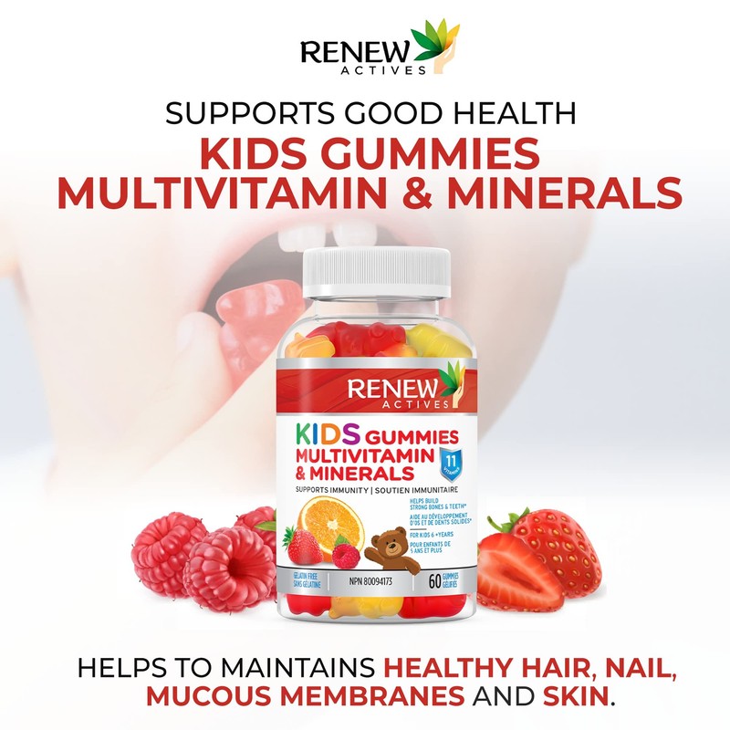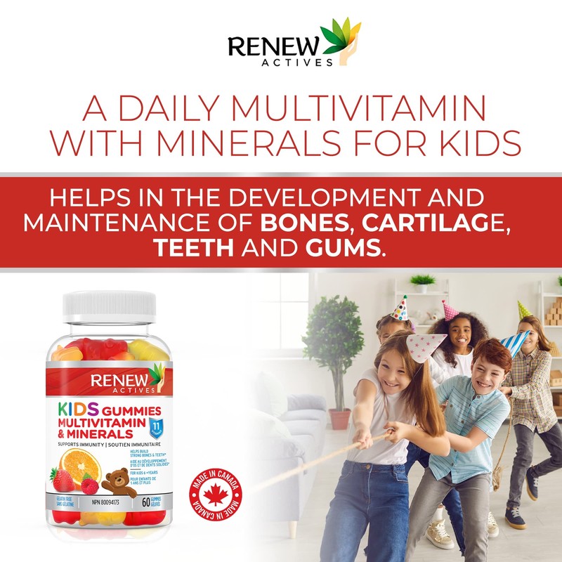 Renew Actives RENEW ACTIVES Kids Multivitamin 4 Gummies per Serving C Supports Health, Hair, Skin, Nails, Eyesight, Strong Bones, Teeth & Gums C Tasty & Nutrient-Rich for Growing Kids C Made in Canada C 60 Gummies