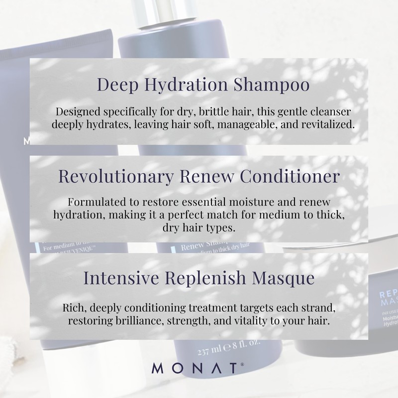 - [DEEP HYDRATION SHAMPOO] - Begin your hair rejuvenation journey with our Renew Shampoo. Designed specifically for dry, brittle hair, this gentle cleanser deeply hydrates, leaving hair soft, manageable, and revitalized. Ideal for medium to thick hair, it lays the foundation for a transformational hair care routine.