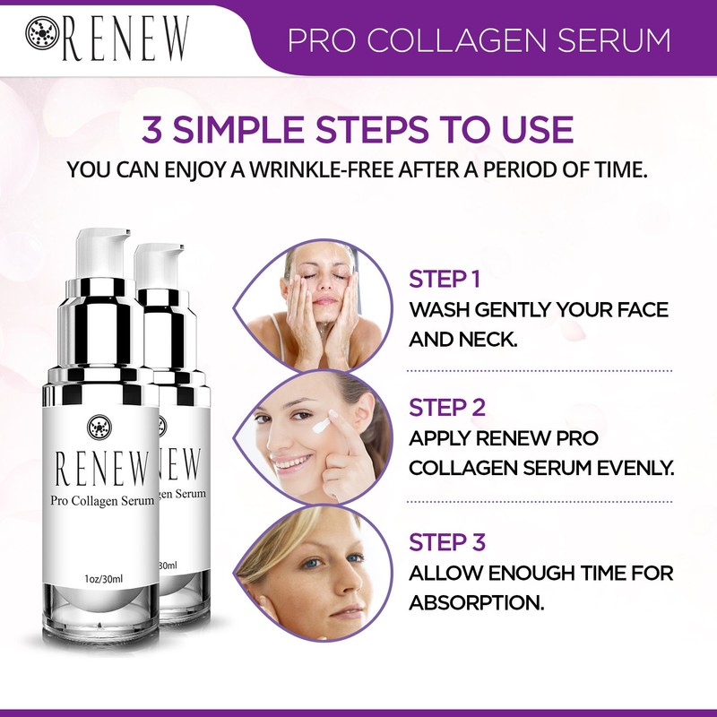 - Renew Pro Collagen Serum Benefits: Smooths fine lines and wrinkles, Brightens hyper pigmentation, protects from free radicals, boost collagen levels, repairs skin at cellular level