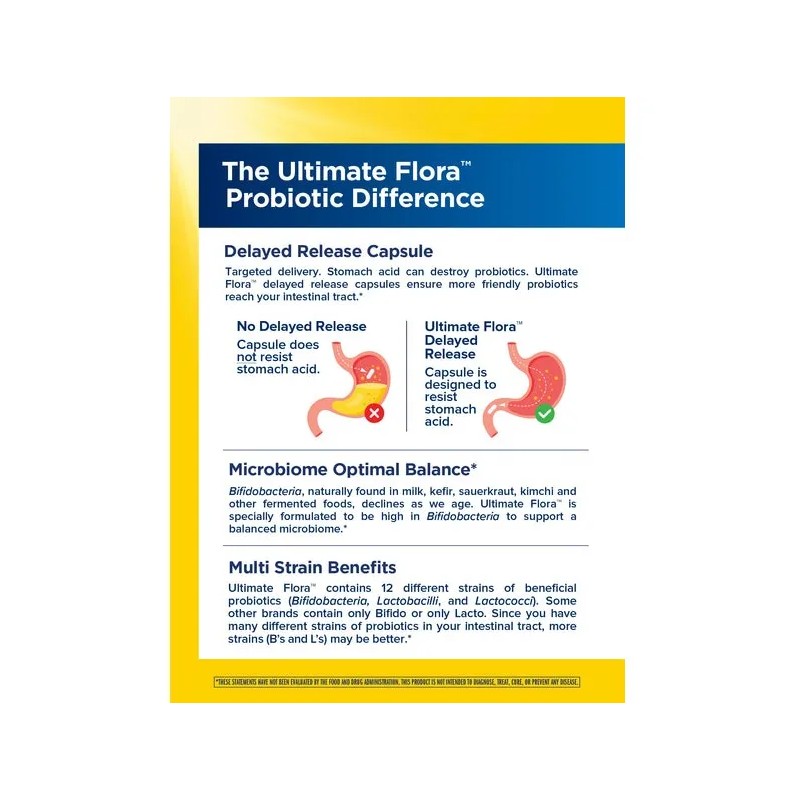 RenewLife Ultimate Flora Extra Care es un probiótico de alta potencia que proporciona 50 mil millones de cultivos activos (UFC) por cápsula y una mezcla balanceada de 12 cepas probióticas cuidadosamente seleccionadas. Está diseñado para restaurar el equilibrio intestinal, mejorar la salud digestiva y fortalecer el sistema inmunológico, especialmente en personas que han tomado antibióticos, tienen digestión irregular o sufren de inflamación intestinal.