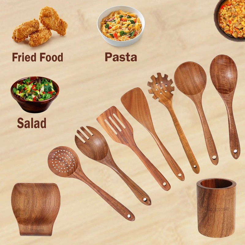 Renexas 9 Pcs Teak Wooden Spoons for Cooking Kitchen Utensils Set Spatulas Rest &Holder