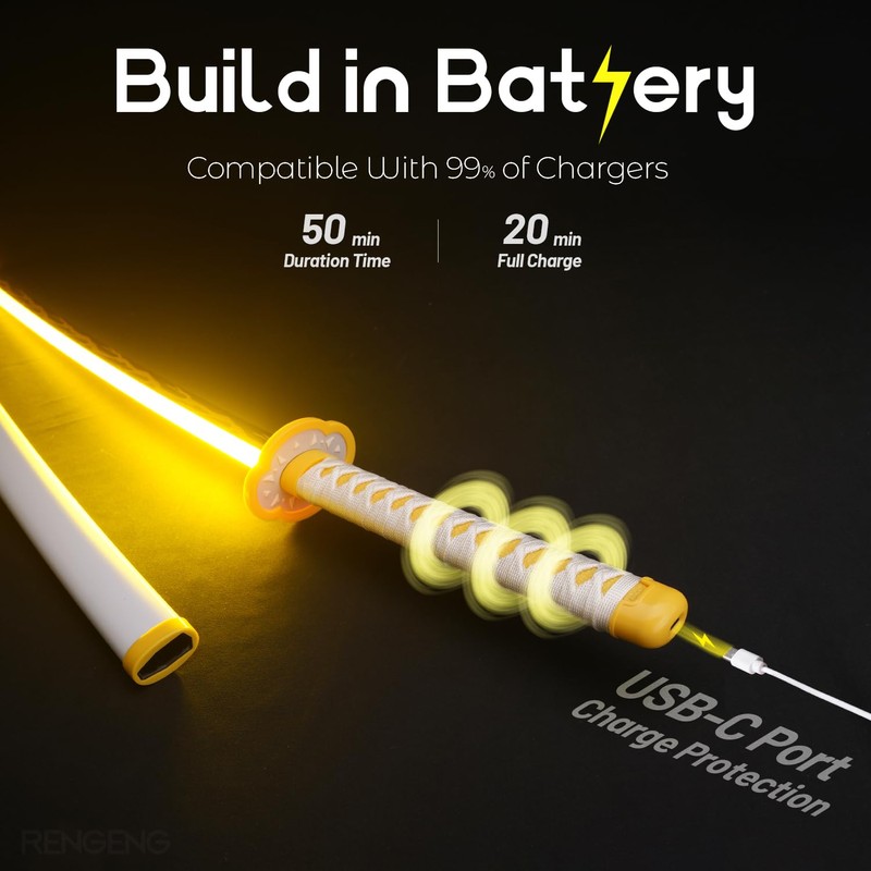 - [Rechargeable] The light-up sword is powered by a rechargeable battery that lasts up to 50 minutes on a full charge, which takes about 20 minutes. Turning the light on or off is as simple as tapping the charging port on the handle twice.