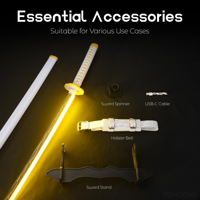 - [Packaging Includes] This package contains: Light Up Sword x1, Holster Belt x1, Sword Stand x1, Sword Spinner x1, and USB-C Cable x1.