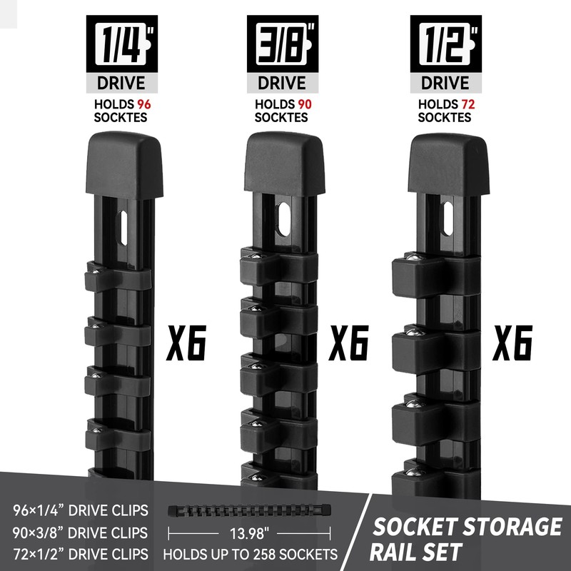 - Large Capacity: We have introduced a single black color to facilitate your needs, holding up to 258 sockets. The socket organizer comes with clips in sizes of 1/4" x 96, 3/8" x 90, and 1/2" x 72.