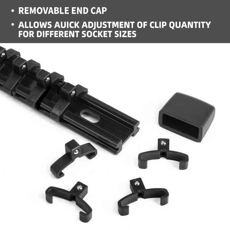 - Convenient to Use: Removable end cap, easy to add or remove clips. Each clip features spring-loaded ball bearings that firmly hold the sockets in place, making it easy to find the right socket when you need it.